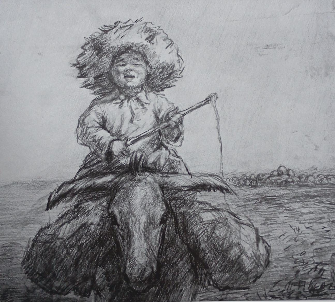 Есек мінген бала. «Қырық өтірік» ертегісіне иллюстрация. 1955 жыл