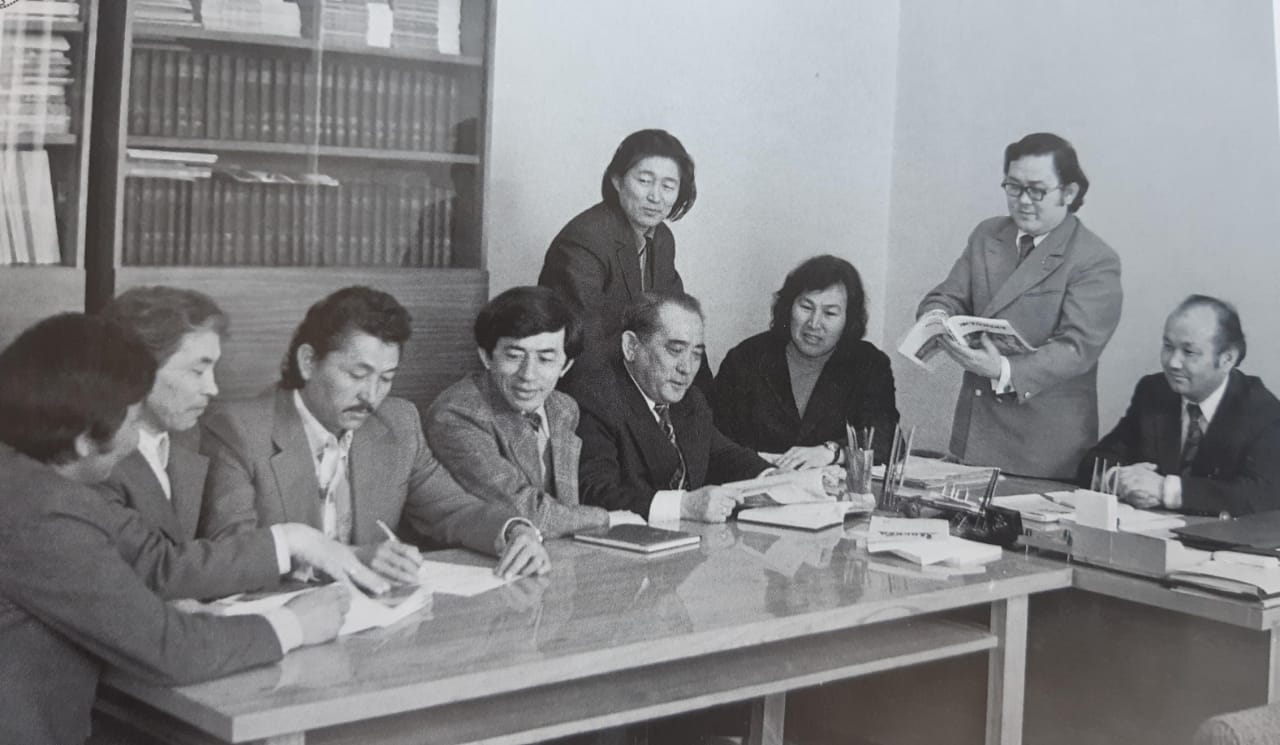 (1978 жыл. «Жұлдыз» журналының редакциялық алқасы журналдың 50 жылдығына дайындық үстінде (солдан оңға): 3-ші – Қажығали Мұханбетқалиев – әдеби қызметкер, одан кейін Ахат Жақсыбаев – жауапты хатшы, Жарасқан Әбдірашев – әдеби қызметкер, Ғафу Қайырбеков – бас редактор орынбасары, Оралхан Бөкеев – әдеби қызметкер, Софы Сматаев – проза бөлімінің меңгерушісі, Бекежан Тілегенов – журналдың бас редакторы.)