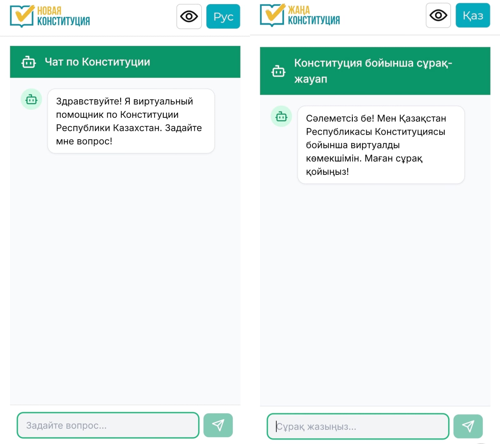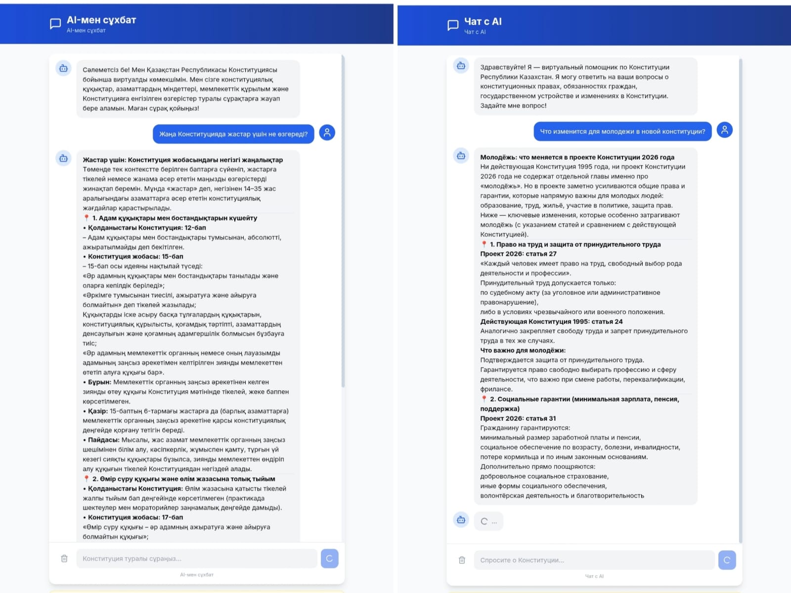 Сонымен қатар сервисте AI-көмекші бар. Ол азаматтардың конституциялық құқықтары мен міндеттері, мемлекеттік құрылым қағидаттары және негізгі түзетулер туралы пайдаланушылардың сұрақтарына жауап береді.