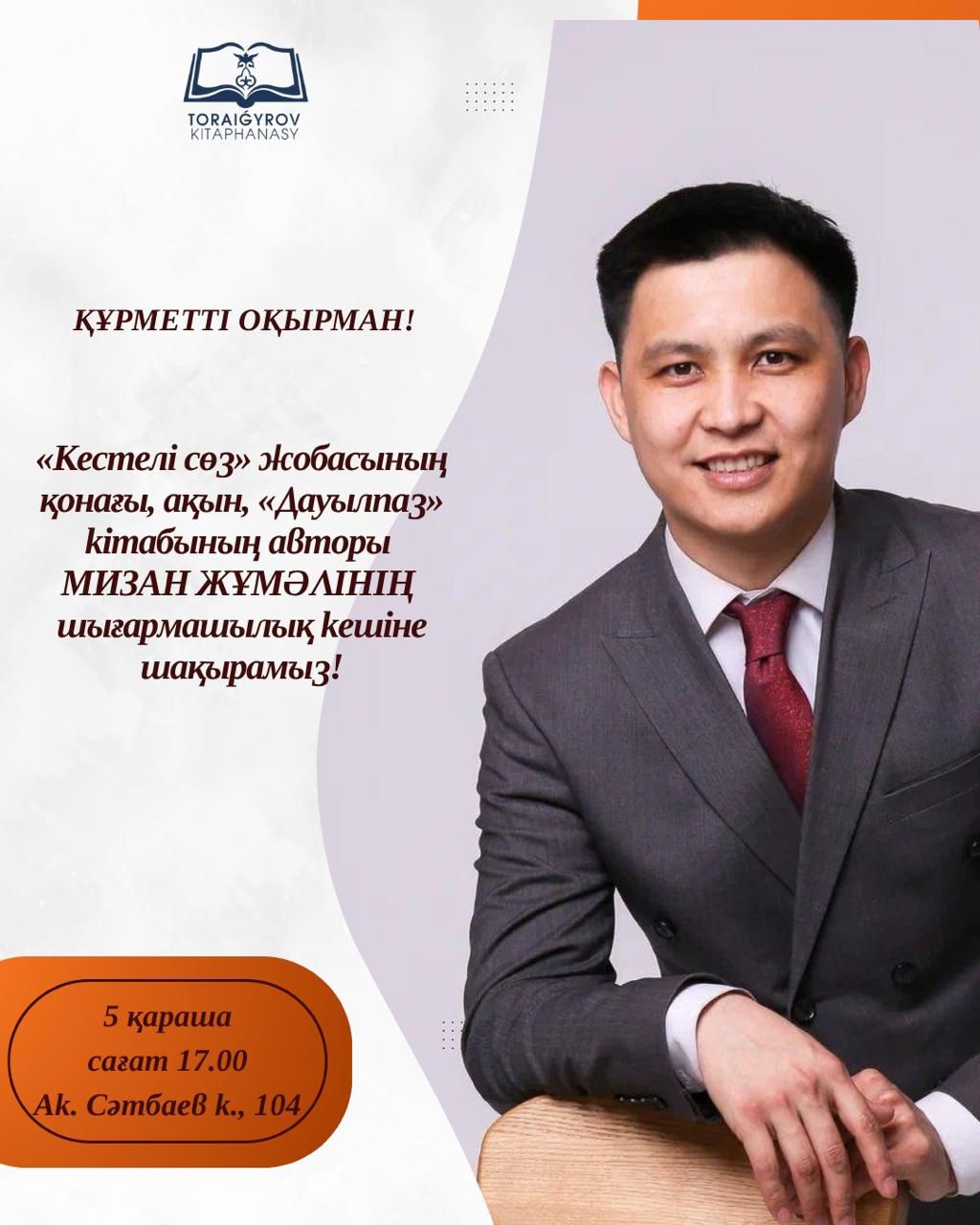 Құрметті оқырман, 5 қараша күні, сағат 17:00-де С.Торайғыров атындағы облыстық кітапханада, «Кестелі сөз» жобасы аясында, «Дауылпаз» поэмасының авторы Мизан Жұмәлімен кездесу өтеді.