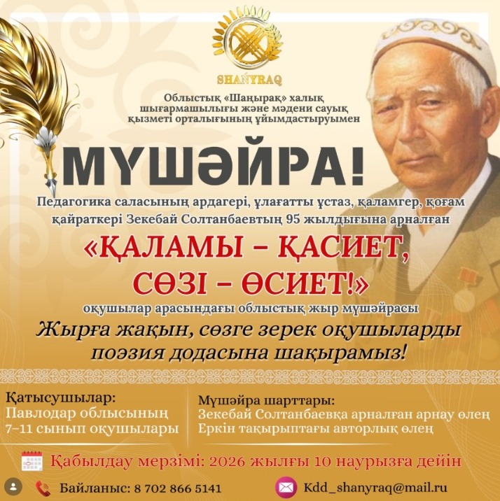 облыстық «Шаңырақ» халық шығармашылығы және мәдени-сауық қызметі орталығы ұйымдастыратын сөз сайысына Павлодар облысының 7–11-сынып оқушылары қатыса алады.
