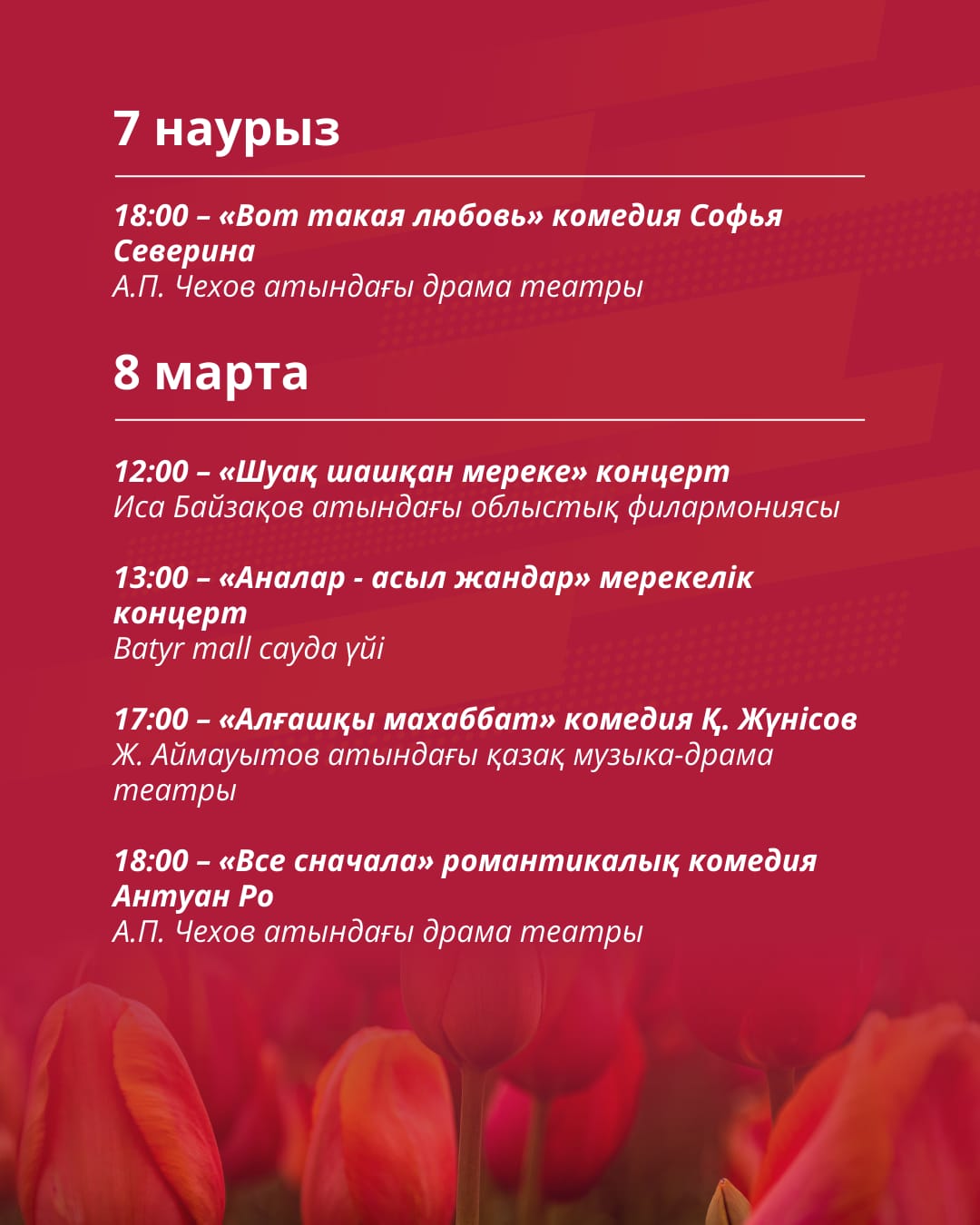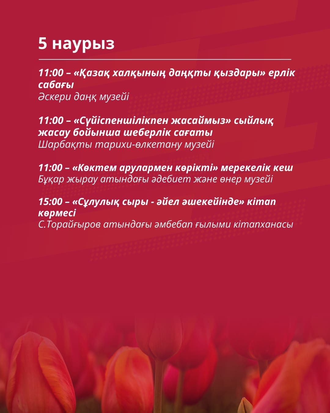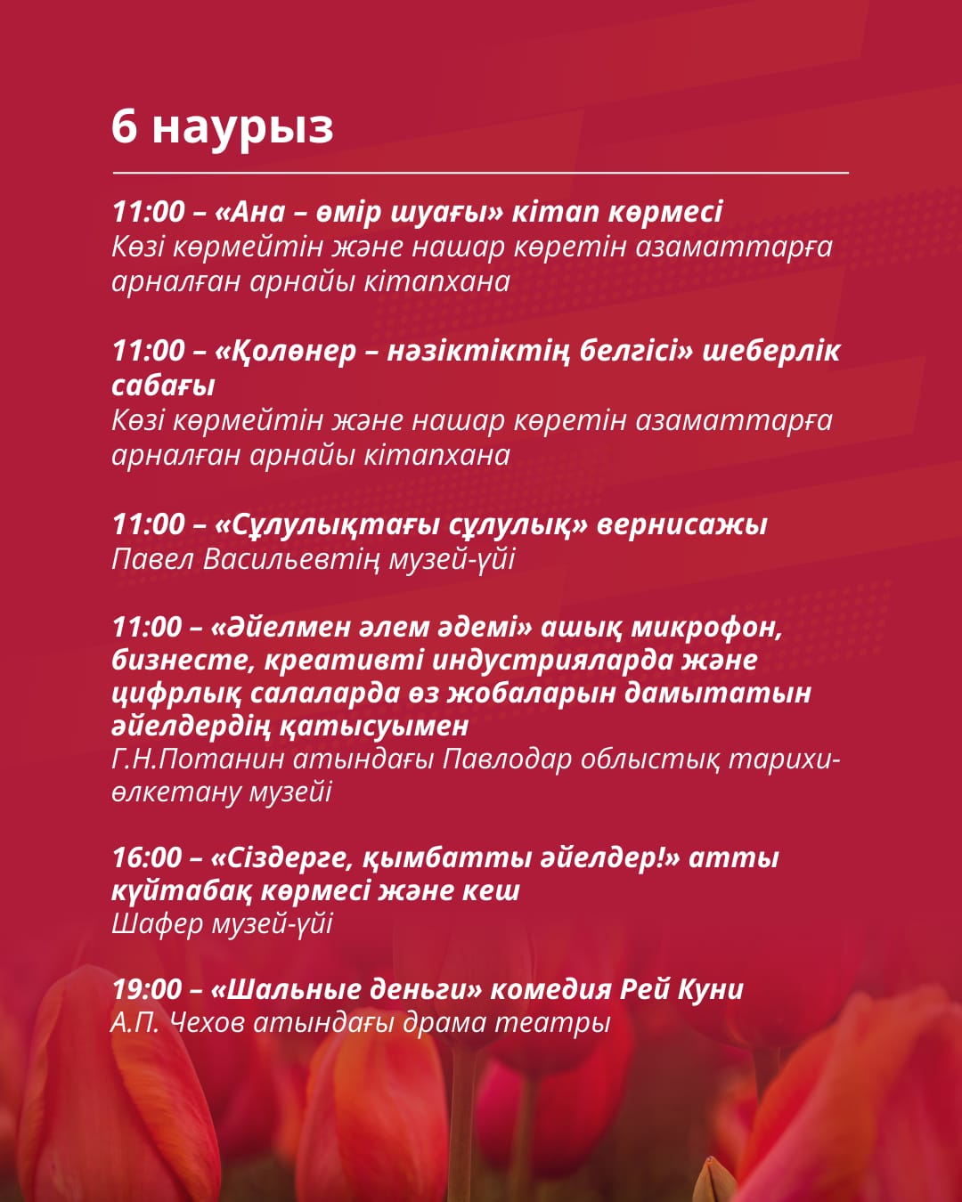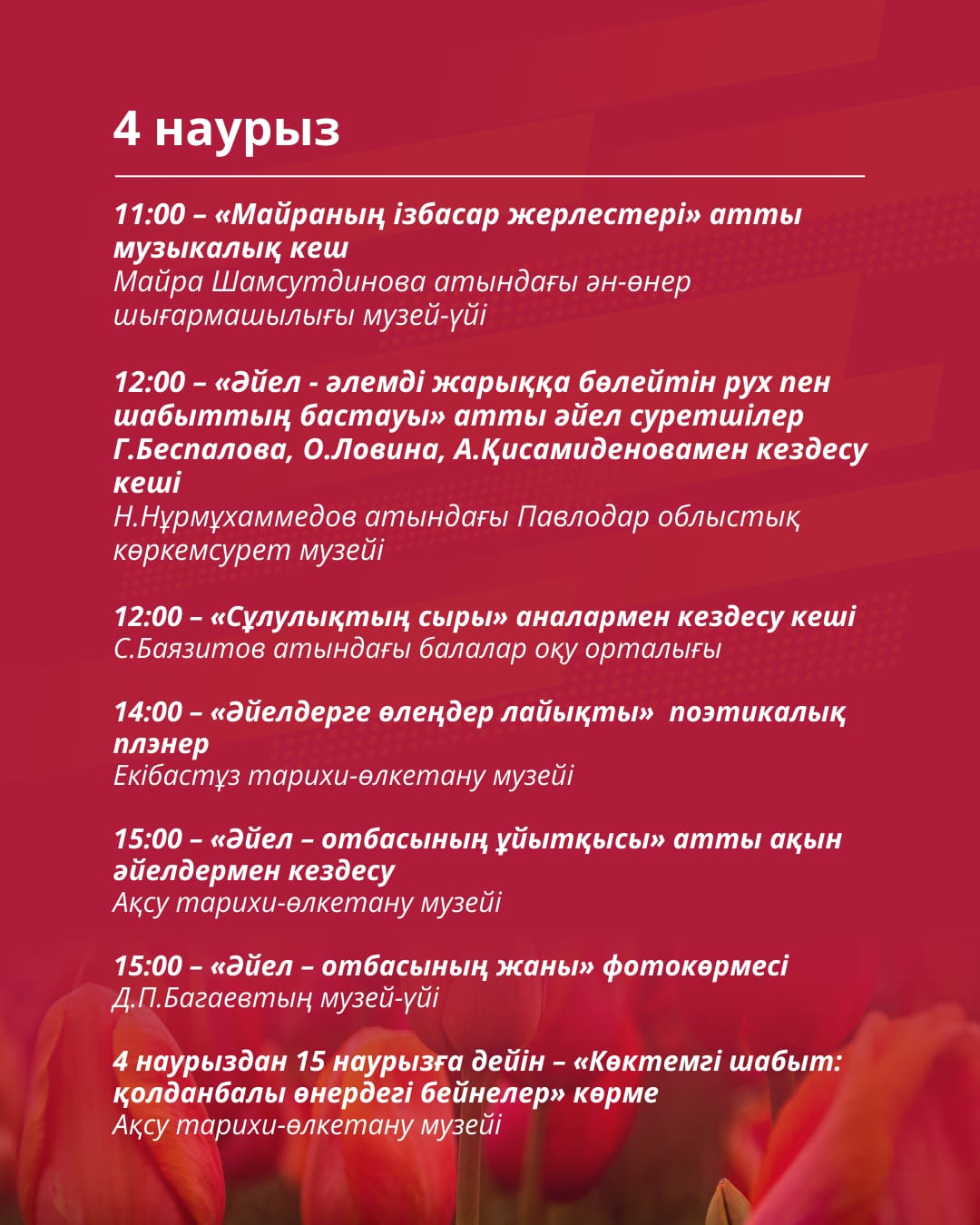 Көктемнің алғашқы күндерімен бірге келетін 8 наурыз – Халықаралық әйелдер күні қарсаңында Павлодар өңірінде ауқымды мәдени бағдарлама жоспарланған. 4-8 наурыз аралығында облыс орталығы мен іргелес қалаларда көрмелер, концерттер мен театрландырылған қойылымдар өтеді. Ендеше, мерекелік күндерді қалай қызықты өткізуге болатынын назарларыңызға ұсынамыз.